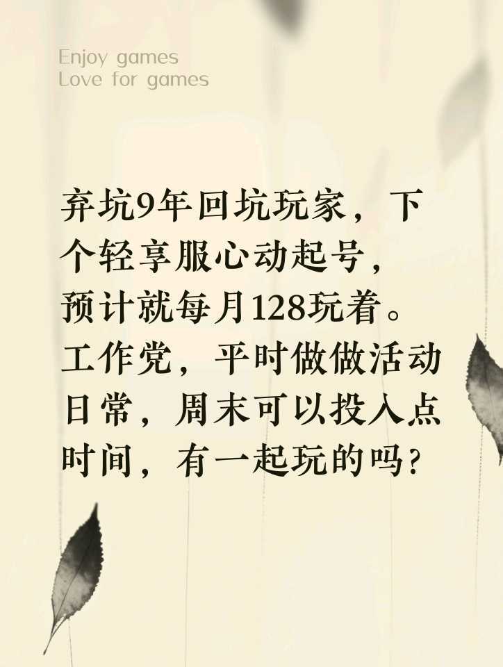 弃坑9年回坑玩家,下个轻享服心动起号,预计就每月128玩着。工作党,平时做做活动日常,周末可以投入点时间,有一起玩的吗?
