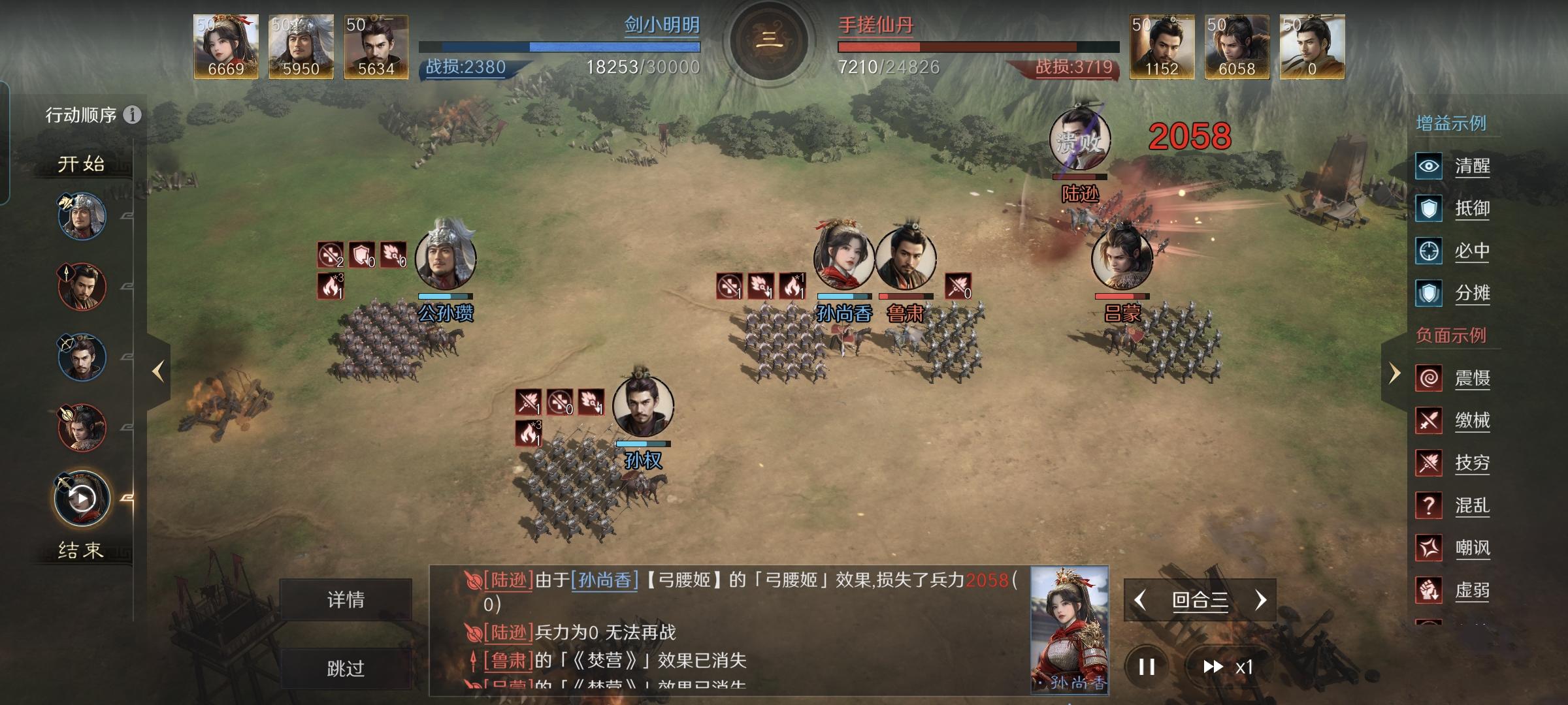 摆出锥形阵,甘宁在前,曹纯和孙权在后。 甘宁的战法有,锦帆渠魁、缮甲厉兵和万夫莫当。韬略库里,研读了虎翼善本、劫术和集气善本。长枪兵特性破敌,专精点亮兵锋益锐。 曹纯的战法有,天下骁锐、披坚执锐和舍生取义。韬略库里,研读了兵令善本、抵力善本和豹略。重骑兵特性坚韧,专精点亮陷阵摧锋。 孙权的战法有,虎踞江东、横扫千军和轻装驰援。韬略库里,研读了敌勇善本、后主和备战善本。长弓兵特性洞悉,专精点亮弦无虚