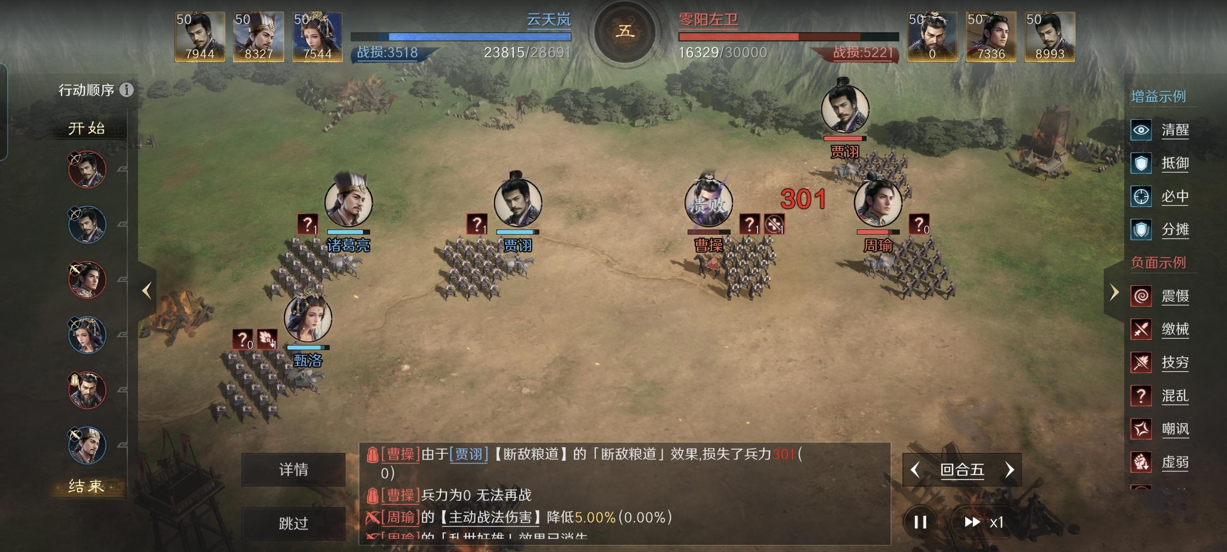 周仓在其默认战法忠烈勇武的基础上,附加了避其锐气和无难之志,除了让自己具备高额的防御和一定的自愈能力,也不忘提升张飞、黄忠的连击率和倒戈。三本韬略,就是为了挨最痛的打而做的准备。 张飞的万人之敌,被小金书新亭侯刀铭把发动率被提升到了100%。第二战法战将夺旗和第三战法水淹七军,把断粮、洪水、震慑、缴械和技穷给对手安排得满满当当。 黄忠在三谋里的定军扬威,仅仅是通过普攻就可以降低对手的先攻和武力。之