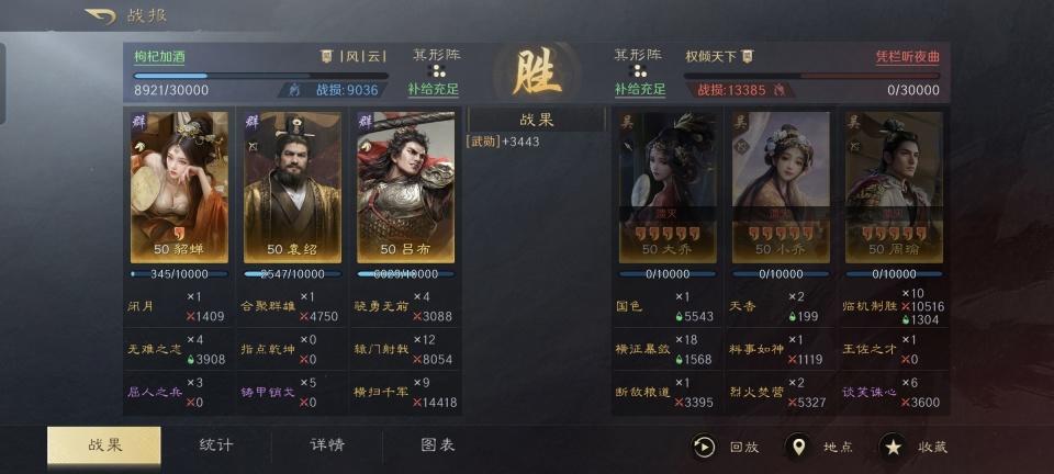 袁绍和吕布,之前在虎牢关打得不可开交,后来又各据一方鲜少往来。按说,他俩确实没什么太多交集,不过三国谋定天下却硬是能把他们凑到了一起。更令人瞠目结舌的是,目前版本的三谋还让袁绍和吕布之间得以合成黑科技! 此番黑科技打法的创作灵感来源,是一个游戏ID名为“枸杞加酒”的哥们,这里需要特别鸣谢一下他。砸重金打造出的满红铜雀弓战队,又是只坚持到了战斗的第三回合就宣告崩溃了。周瑜和小乔,几乎是同时被吕布给清