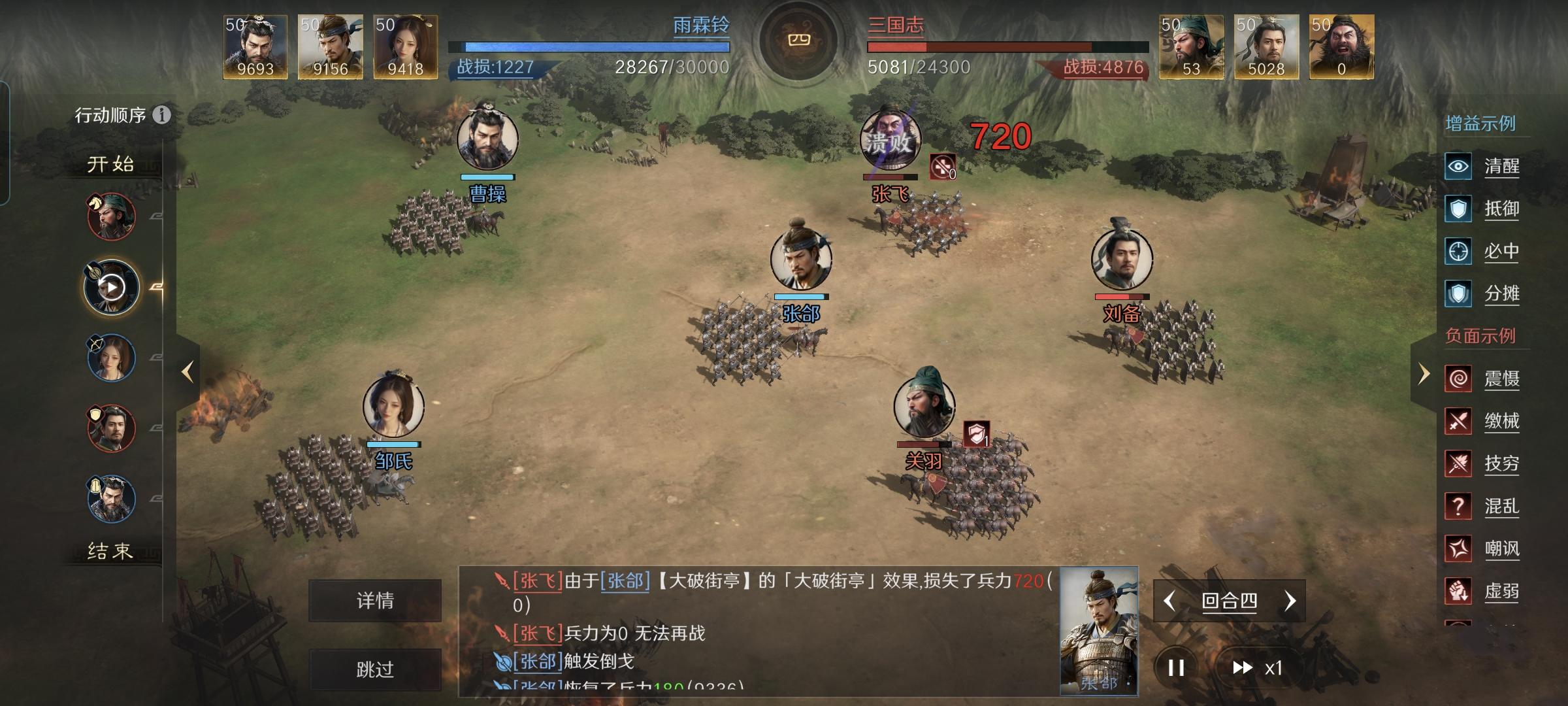 玩了两个赛季的三谋,极少见到关羽和关平一起上阵的情况。原因倒也简单,这父子二人在游戏里面都很鸡肋。我估计几乎不会有人想到会用他们去打什么主力队伍,这压根就是战功宝宝吧! 在此特别鸣谢游戏ID名为“银手”的玩家朋友,他用麾下的关羽、关平和曹仁摆出雁形阵,向我们生动演示了如何击破刘备、张飞和马超组成的忠义骑。战斗仅仅进行到半场,关平就拿下了张飞做一血,刘备、马超也很快支撑不住。看上去各种演的关家军,是