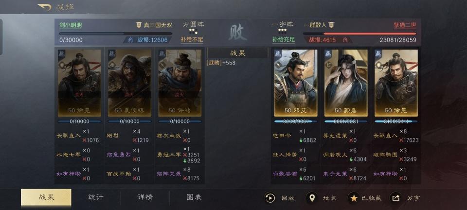 算无遗策的郭嘉和长驱直入的徐晃,若是在三国谋定天下的游戏次元里搭班子,会是什么样的情况?相信但凡玩过三谋的朋友,都会立马联想到一个词,那就是“技穷”。具体能把对手穷到什么样的地步,本文的这场战报就能生动呈现出来。 即便被对方打了个鼻青脸肿,我也还是要在此特别鸣谢这个游戏ID名为“紫猫二世”的哥们。他麾下的郭嘉、徐晃和邓艾队,轻松团灭了我这边的许褚、夏侯惇和徐晃队。我方战败的原因一目了然,那就是我这