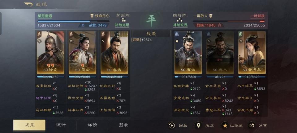 “美周郎”周瑜与“和事佬”鲁肃,都是孙吴集团内部顶梁柱式的人物。在东吴四大都督之中,他二人的辈份和资历相比起吕蒙和陆逊而言无疑更高。三国谋定天下的游戏次元中,对于这两个角色的包装也是下足了功夫,铜雀弓、缴械枪这样的王牌组合都是以这二人为核心展开的。 言到此处,自然就得把本文的特别鸣谢对象给带出来了。这个游戏ID名为“星月童话”的玩家朋友,在世界公共频道里分享了一套别出心裁的打法。他选取了周瑜、鲁肃