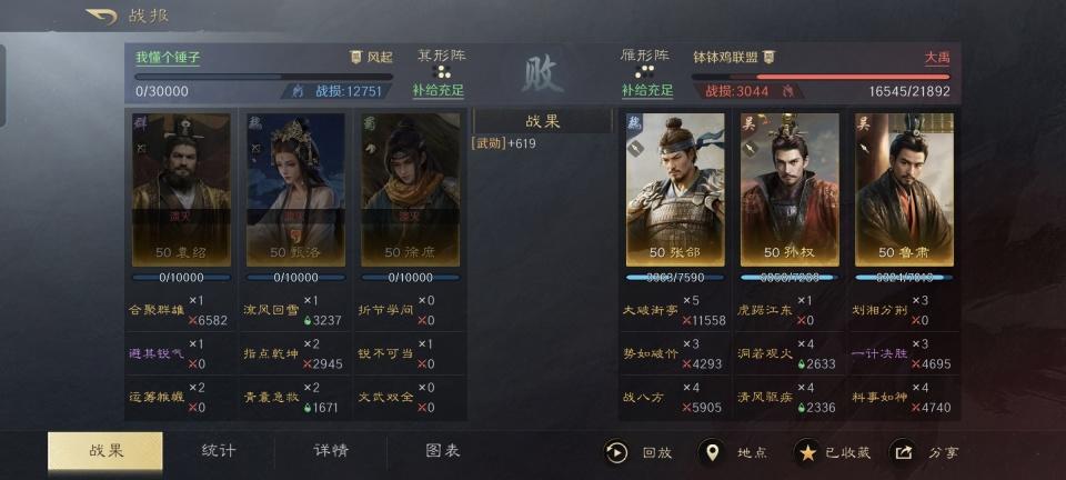 鲁肃为人处世讲究和气生财,放眼孙吴集团的四大都督,他最大的与众不同,就是唯一一个没有在明面上跟蜀汉盟友剑拔弩张甚至直接起冲突的都督。正是因为如此特性,鲁肃在三国谋定天下里才被匹配了缴械神技划湘分荆,从而坐实了他在游戏中“缴械一哥”的别称。 面对徐庶和袁绍两个黑科技大佬组成的队伍,鲁肃也能应变自如,甚至把他们限制到一个大招都放不出来。在此特别鸣谢游戏ID名为“大禹”的玩家朋友,他在世界公频分享的战报