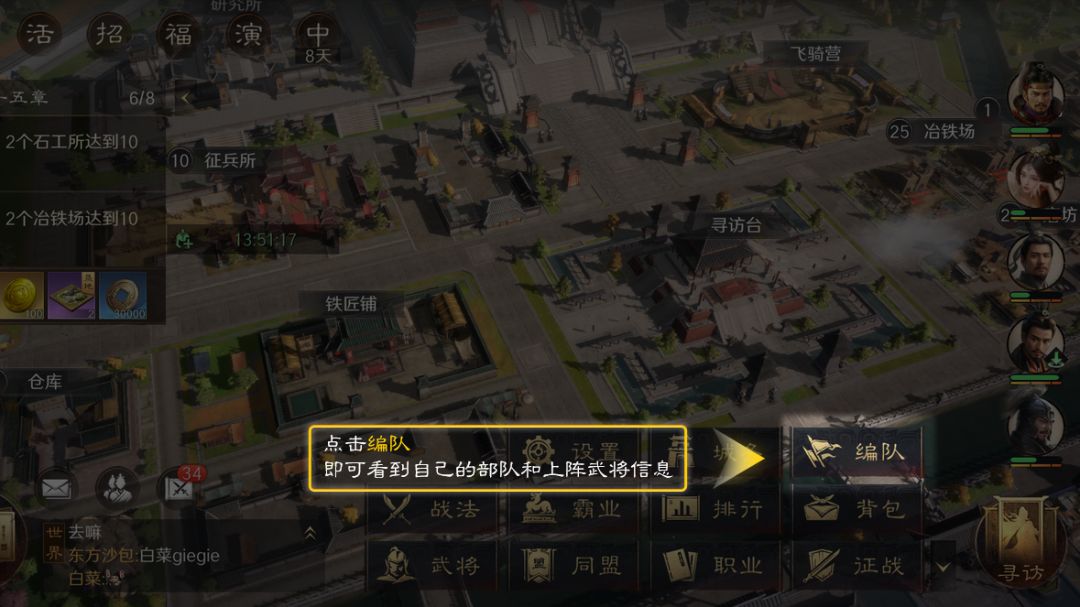大家好,本期奉孝,将为大家带来“任务系统怎么玩?”的攻略。 一、任务系统 游戏的左侧就是任务列表,任务列表列举了当前章节所需完成的任务。 完成单个任务可以获得资源、铜币等奖励。每完成一个章节的任务,就有机会能够获得黄金、铜币、“烤鸡”等奖励。而体力恢复道具“烤鸡”,是前期任务的重要奖励之一,要尽早获取。 二、任务系统应该怎么做 各位玩家可以跟随前期的任务指引,对开垦地和建筑进行升级,完成任务所获得