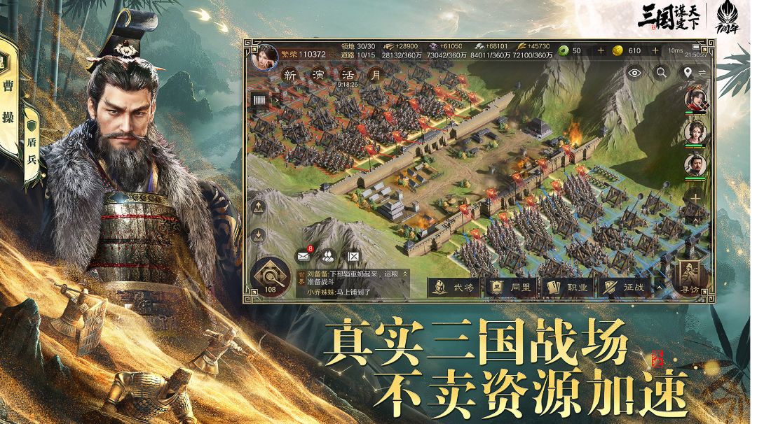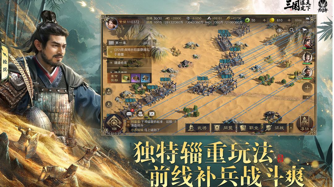 #三国谋定天下创作征集令 同盟加入:游戏伊始,尽快加入一个实力靠前的同盟。大盟不仅能提供更多的资源分红,而且在多人战斗中,更能体验到游戏的激情与热血,还能获取一些特殊的盟内福利,帮助玩家在开荒阶段快速成长。 武将抽取与阵容初定:进入游戏后,先把系统赠送的免费铜币和玉石全部用于抽取武将。普通卡池建议只抽有 5 折优惠的次数,合理规划资源。根据抽到的武将,初步组建开荒阵容。一般来说,开荒前期选择两名