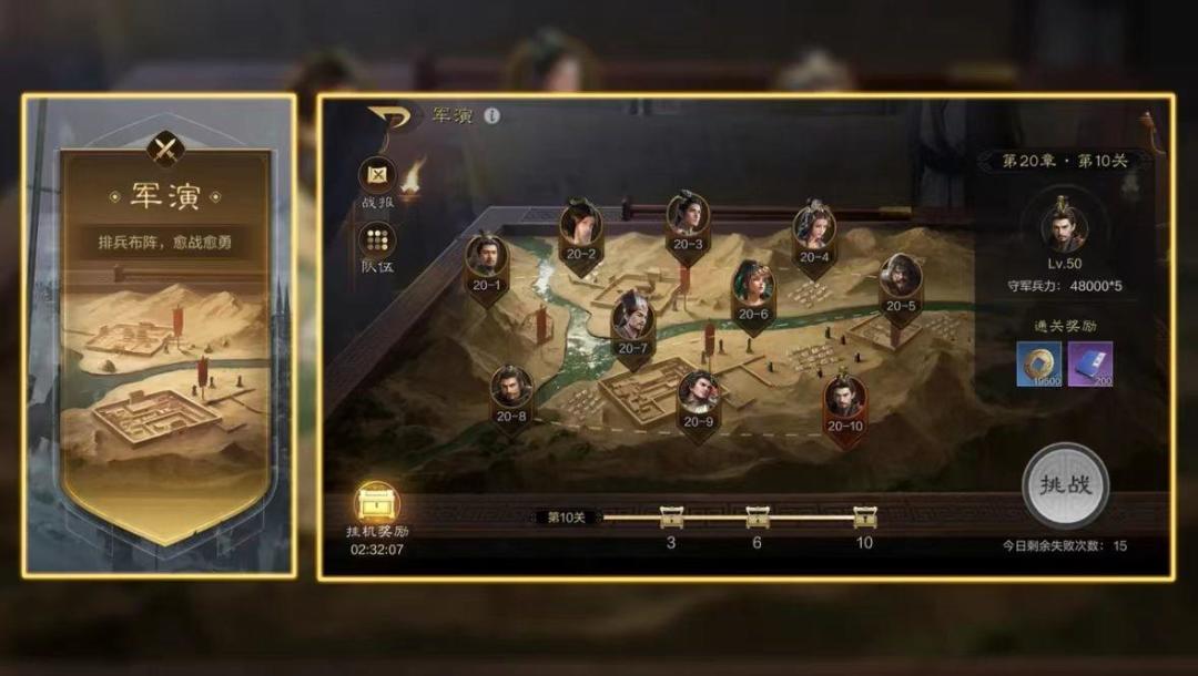 大家好,本期奉孝,将为大家带来“军演玩法”的详细攻略。 一、军演玩法介绍 1.玩法解锁: 按照时间逐步解锁挂机收益,关卡进度不重置。 2.玩法奖励: 资源、天赋经验、铜币、储备经验、打造材料箱。 3.刷新次数: 玩家在征战里可以看到军演活动,军演每日7点刷新15次失败次数,失败次数用尽后当日无法继续挑战。 4.玩法说明: 军演为一次性挑战玩法,通关每个关卡后可获得首通奖励; 通过章节关卡节点(3、