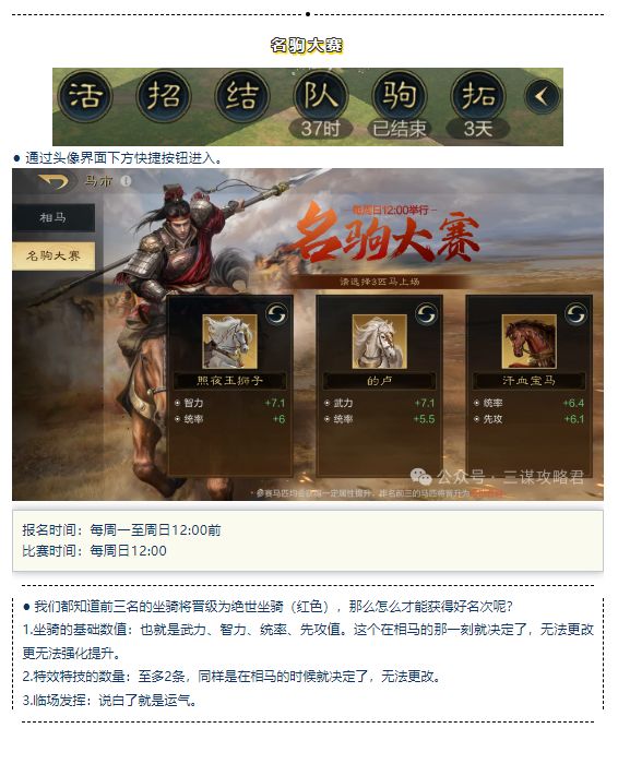 各位主公,“名驹大赛”与“演武大会”两大特色玩法已正式开启,为此乔妹专门准备了本篇攻略带大家详细看看这两大玩法到底怎么玩,话不多说,走起~ 名驹大赛 于霸业【兵临城下】阶段解锁,在每周日中午12:00进行比赛(开服首周不开启)。 1.在《三国:谋定天下》中,可以去马市相识马匹,主公可通过军演、远征、商店等途径获取相马令。 2.高级马匹的获取概率随着相马师等级的提升而提高。 3.获取马匹后,主公可以
