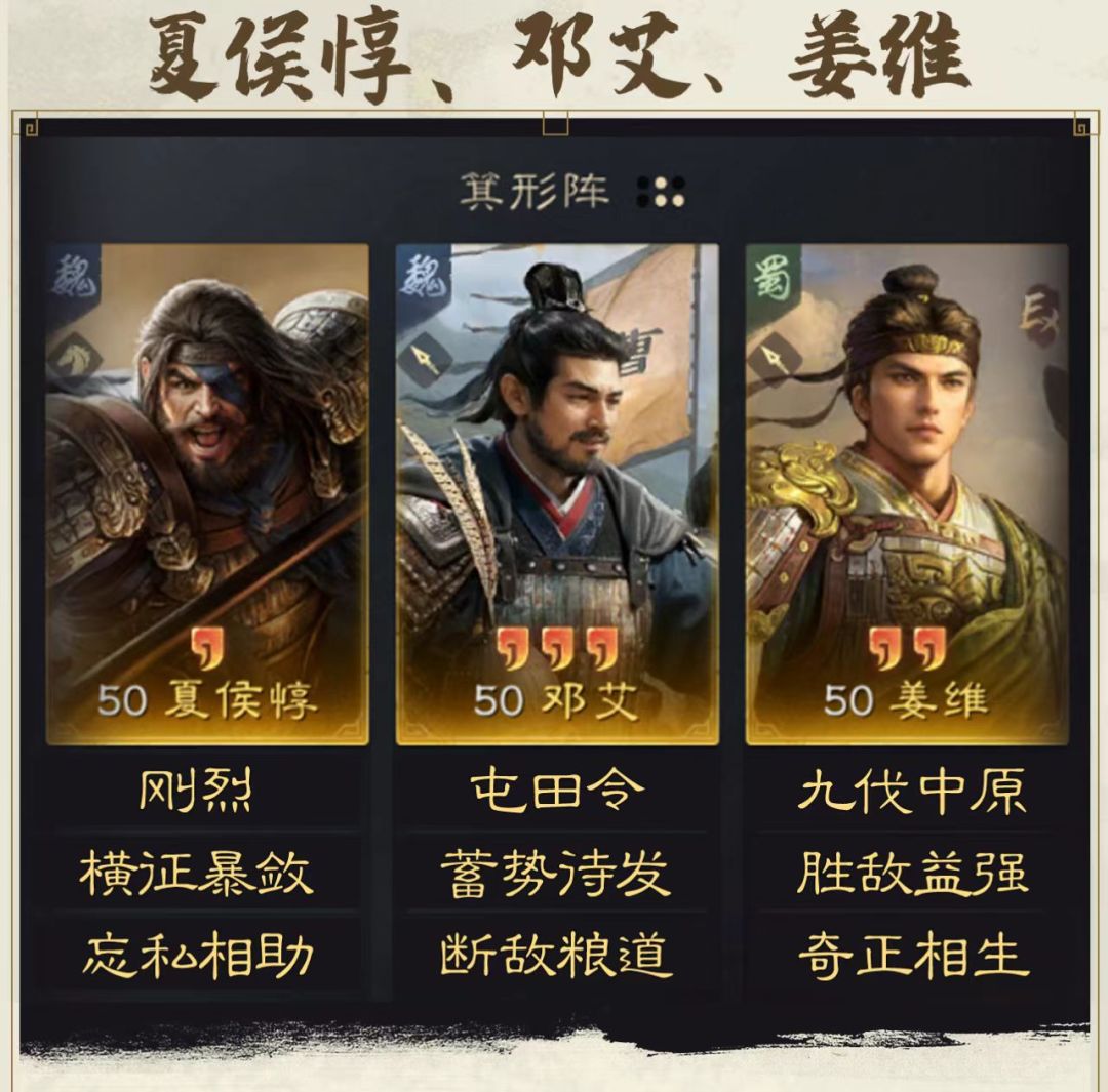 1. 夏侯渊,邓艾,姜维~~阵容分析 夏侯惇邓艾构成经典“双减”体系 邓艾的存在能帮助姜维过渡前三回合,不仅能够叠加【胜敌益强】层数,还能提供减伤;夏侯惇则提供大额减伤,保证队伍整体坦度。通过强大的续航能力与后期输出能力来拖垮敌方。 2.乐进,甄姬,文丑~~阵容分析 本赛季“赵甘姜”体系来势汹汹 由此开发出一套围绕“必中”特性克制闪避体系的队伍。 文丑自带战法能够提供“必中”效果,能够有效针对到赵