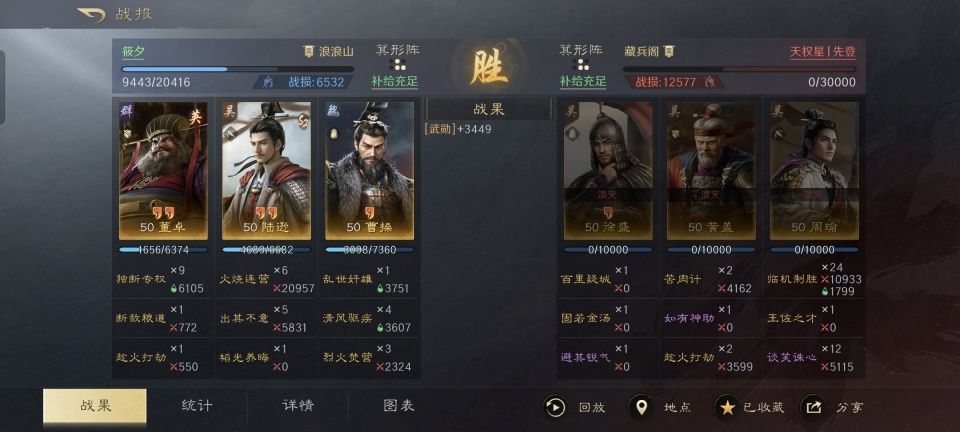 赤壁之战,曹操被周瑜的火攻杀得大败而归,这是后世人都知道。所以三国谋定天下的游戏次元,也没有给曹操设定太高的火攻天赋,然而这并不是他真不能玩火的理由。只要脑回路清奇,让曹老板偶尔体验一下烧烤别人也是可以的。 在此特别游戏ID为“筱夕”的玩家朋友,为本体提供了宝贵的创作素材。他不仅让曹操玩起了火攻,连话本版的董卓也安装上了火舌,配合着陆逊一起摆出了箕形阵,把对面周瑜领衔的徐黄盾给击败了。三个人,三把