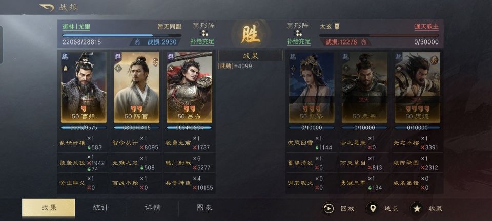 曹操是个乱世奸雄,三国迷们无人不知。如今的诸多三国题材SLG游戏,也会拿这个词来命名他的专属战法。不过三国谋定天下的策划,却显得有些脑洞大开,把乱世奸雄给设计成了个不死小强的技能。如此这般,就让一些同样脑洞大的玩家看到了剑走偏锋的路子。 本文的主角,是一个名叫“就是那个帅哥”的玩家,他在世界里公频里发出了自己用42级曹操、典韦和邓艾逼平50级诸葛亮、周瑜和大乔的战报。虽然没有取得完全的胜利,然而在