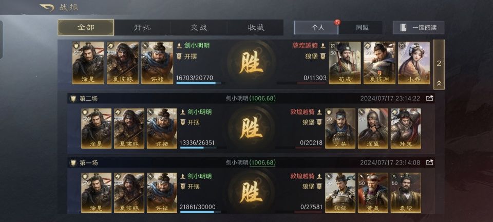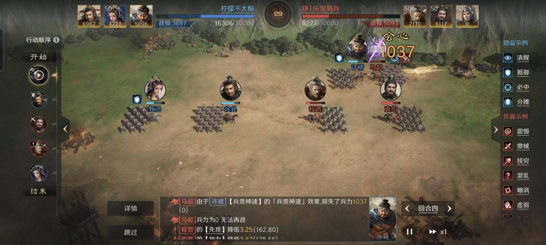 许褚在当前版本的三国谋定天下虽然不是那么受欢迎,人气比起老大哥典韦还是差了不止一星半点,不过他默认自带100%的连击率,依旧让我们有着很广阔的探索空间。 在此特别鸣谢游戏ID名为“柠檬不太酸”的玩家朋友, 给本文提供了宝贵的创作素材。徐晃、甄洛和许褚三人摆出箕形阵,轻松拿捏了对面的马超、袁绍和程普。 战斗进行到第四回合,许褚就手刃了马超,可比演义里面要炸裂太多了。究竟是如何筹谋才能完成速胜,且看下