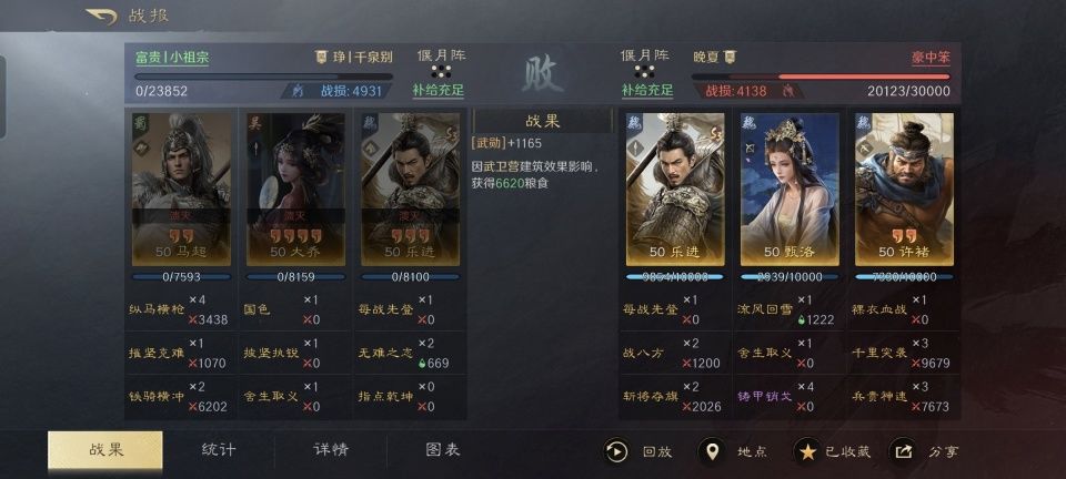 按照演义的描写,许褚和马超可是大战了数百回合都没有分出胜负的,二人的实力想必就在伯仲之间。不过在三国谋定天下的游戏次元里,马超的受欢迎程度可是比许褚高太多了,至少在S1和S2赛季,许褚真是相当的沉寂。 在此特别鸣谢游戏ID名为“豪中笨”的玩家朋友,给本文提供了宝贵的创作素材,也让我们见识到了一个全新的许褚。豪中笨利用乐进、甄洛和许褚摆出偃月阵,才第一回合就击溃了对面的大乔,剩下的马超和乐进也在第二