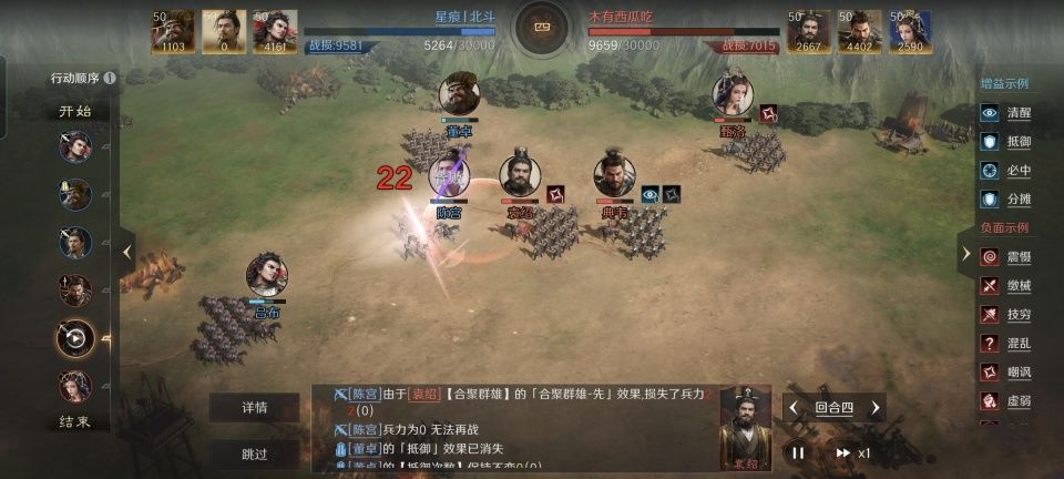 古之恶来典韦,本可以在他所处的时代打出一番惊天动地的战绩,却因为老板曹操被夜间扫黄而早早领了盒饭。如果让他跟随袁绍,会不会让河北四庭柱升级成河北五虎呢?三国谋定天下的游戏次元,还真让玩家们可以进行这样的尝试。 特别鸣谢游戏ID名为“木有西瓜吃”的玩家朋友,他用四世三公的袁绍和典韦、甄洛组成了三公虎卫,给我们带来了一场漂亮的速攻战,也为本文提供了宝贵的创作素材。此战,三公虎卫摆出了锥形阵,典韦在前,