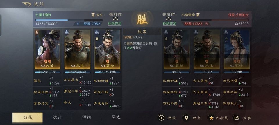 大乔、小乔姐妹二人再加上周瑜,在三国谋定天下的游戏次元里会成为铜雀弓组合,想必老玩家们都知道,也多数都实际体验过他们的威力。不过让大乔和典韦、曹操搭班子合成铜雀枪的打法,想必就十分罕见了吧! 在此特别鸣谢游戏ID名为“七星丨绵竹”的玩家朋友,为本文提供了宝贵的创作素材,实在是脑洞开得太妙了!他是如何利用麾下的铜雀枪,将对面传统的洛神虎卫团灭的呢?接下来的段落,会带着各位一探究竟。 大乔战法:国色+