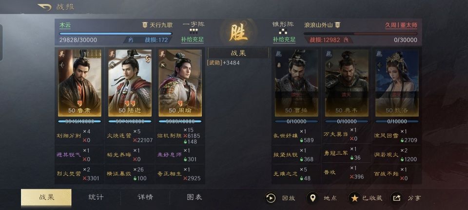 大乔身处本方箕形阵的前排,第二和第三战法分别匹配了断敌粮道和铸甲销戈。韬略库里没有选择研读专属的金书,而是配了大破、避险和援道的善本。是要通过断粮和给后排的周瑜、鲁肃提升输出的办法,来扩大对敌方的伤害。 周瑜在在临机制胜的基础上,学习了料事如神和烈火焚营。金书火计之后,搭配了料敌和奇智的善本。除了放火,他的另一个重点任务是压制住对面的技能施放。无论是曹操、黄月英的辅助效果还是典韦的输出战法,都要力
