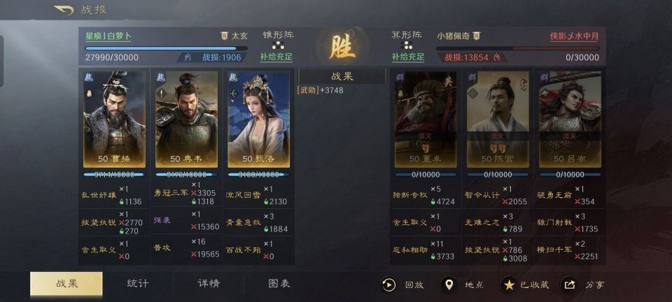“古之恶来”典韦的武力值到底怎么样,一直以来都是众说纷纭,毕竟他退场得太早,缺乏像关羽那样斩杀名将的战例。不过三国谋定天下的游戏策划团队,还是相当看得起典韦的,战法兵书搭配到位的话,吊打无双飞将吕布都不是问题。 特别鸣谢游戏ID名为“星痕丨白萝卜”的玩家朋友,为本文提供了宝贵的创作素材。他用麾下的曹操、典韦和甄洛组成洛神虎卫,三回合之内就打趴了对面的吕布、话本董卓和陈宫。尽管这个阵容上并没有什么太