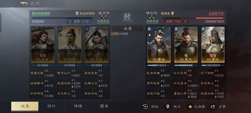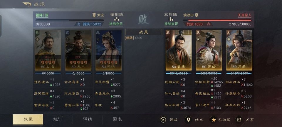 江东孙吴集团的第三任都督吕蒙,其戎马生涯最著名的一战莫过于白衣渡江背刺关羽。要不是玩偷袭,他本人的战斗力也就那样了。在三国谋定天下的游戏次元里,吕蒙只能算得上是次一流的橙色武将,任谁也想不到他竟然有机会在战场上手刃典韦,这可是连吕布都不一定能轻松办到的事情啊! 在此特别鸣谢游戏ID名为“天真星人”的玩家朋友,别看他麾下的鲁肃、周瑜和吕蒙都是白板,却硬生生击败了对面四红的刘备以及满红的典韦、甄洛。更
