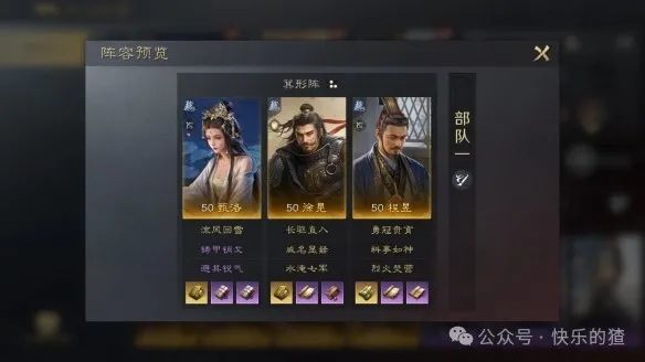 三国谋定天下甄洛徐晃程昱阵容1.阵容介绍 这个阵容是以施加多种负面状态达到低战损结束战斗为核心,徐晃和程昱多种控制限制敌人的同时,配合甄洛的“会心”效果,可以快速打出爆发。 战法替换:甄洛可选:【蓄势待发】徐晃可选:【如有神助】【辕门射戟】程昱可选:【奇门遁甲】【筹划良策】阵容延伸:甄洛是队伍的防御、治疗核心,甄洛可替换为黄月英,能够给队友带来增益,黄月英携带【避其锐气】和【清风驱疾】。徐晃属于队