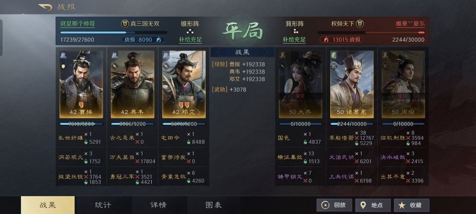 曹操是个乱世奸雄,三国迷们无人不知。如今的诸多三国题材SLG游戏,也会拿这个词来命名他的专属战法。不过三国谋定天下的策划,却显得有些脑洞大开,把乱世奸雄给设计成了个不死小强的技能。如此这般,就让一些同样脑洞大的玩家看到了剑走偏锋的路子。 本文的主角,是一个名叫“就是那个帅哥”的玩家,他在世界里公频里发出了自己用42级曹操、典韦和邓艾逼平50级诸葛亮、周瑜和大乔的战报。虽然没有取得完全的胜利,然而在