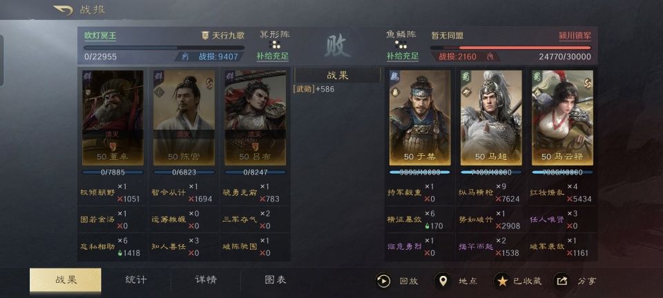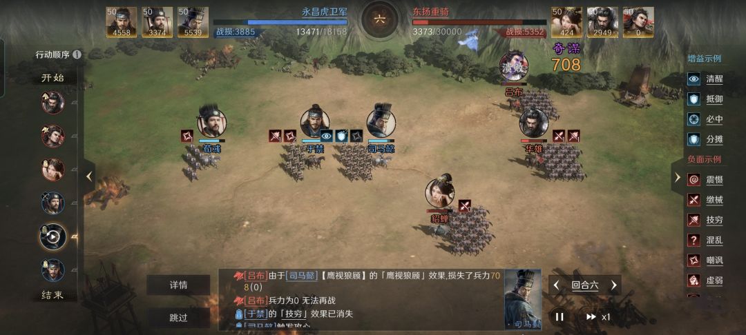 无论是天下无双的吕布还是西凉骁将华雄,他们在当前版本的三国谋定天下里,都是非常注重普通攻击伤害的。因此,但凡能够缴械的武将,就成为了他们的克星。只不过令很多人意想不到的是,于禁这个软弱的投降派,竟然能在游戏里爷们一回,甚至凭一己之力把吕布和华雄都制服了。 特别鸣谢游戏ID名为“永昌虎卫军”的玩家朋友,给本文带来了宝贵的创作素材。他利用于禁、荀彧和司马懿摆出箕形阵,18000多的残军兵力依旧打趴了对
