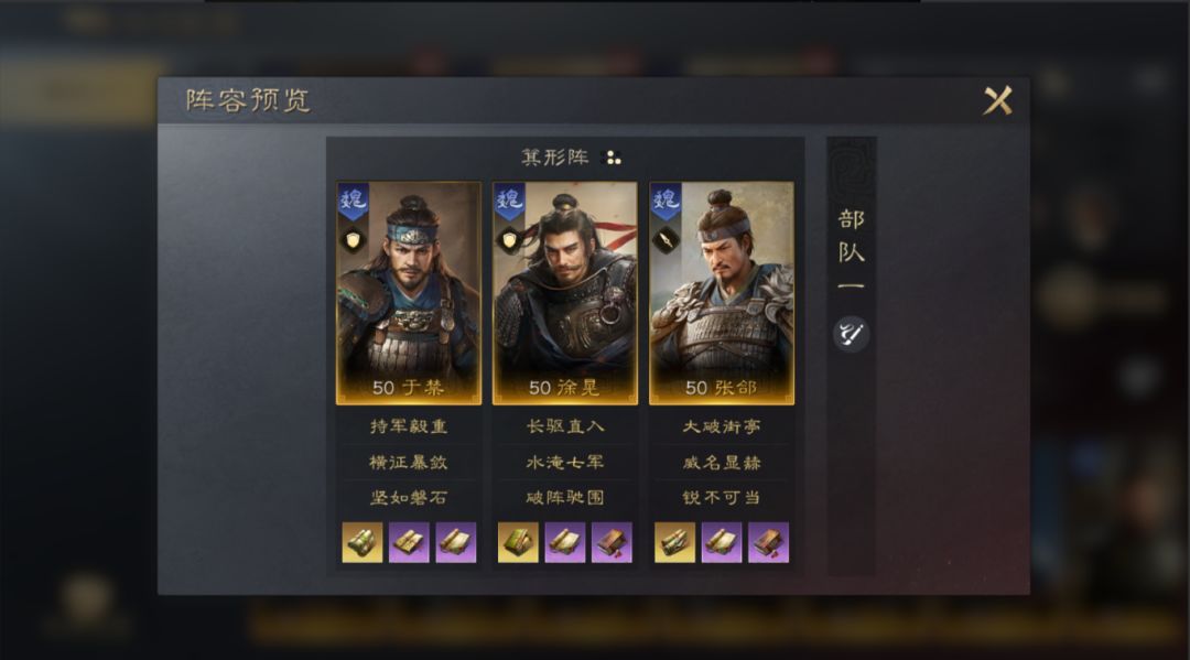 大家好,本期奉孝,为大家带来一套开荒阵容推荐-五子良将之于禁、张郃、徐晃。 一、阵容简介 这个阵容是以控制状态为思路核心,于禁和张郃针对追击队伍限制输出,徐晃则是针对主动队伍不让其核心武将爆发,正是集控制和伤害于一身的队伍。 战法替换: 于禁可选:【忘私相助】 【避其锐气】 徐晃可选:【如有神助】 【战八方】 张郃可选:【破阵驰围】【势如破竹】 阵容延伸: 于禁是队伍前排,优先选择承伤武将,于禁可