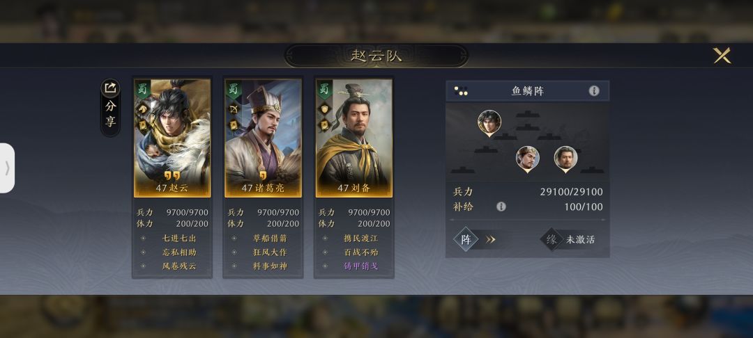 #新年新安利 摆出箕形阵,夏侯惇在前排,邓艾和郭嘉在后排。卦象依次是乾、震和坎,围绕着郭嘉来整,让他在维持一个相对稳定状态的前提下,强势控制整个战局。 夏侯惇的战法有,刚烈、坚如磐石和横征暴敛。韬略库里,研读了守土善本、避险善本和威慑。 邓艾的战法有,屯田令、百战不殆和蓄势待发。韬略库里,研读了励军善本、济河论和避勇善本。郭嘉的战法有,算无遗策、烈火焚营和奇门遁甲。韬略库里,研读了天妒、鬼谋善本