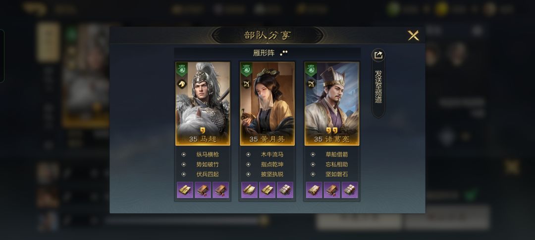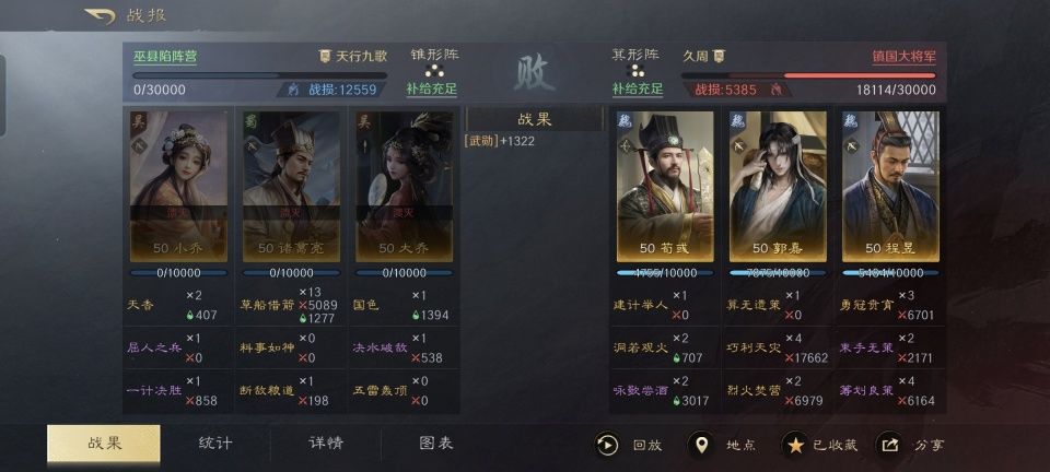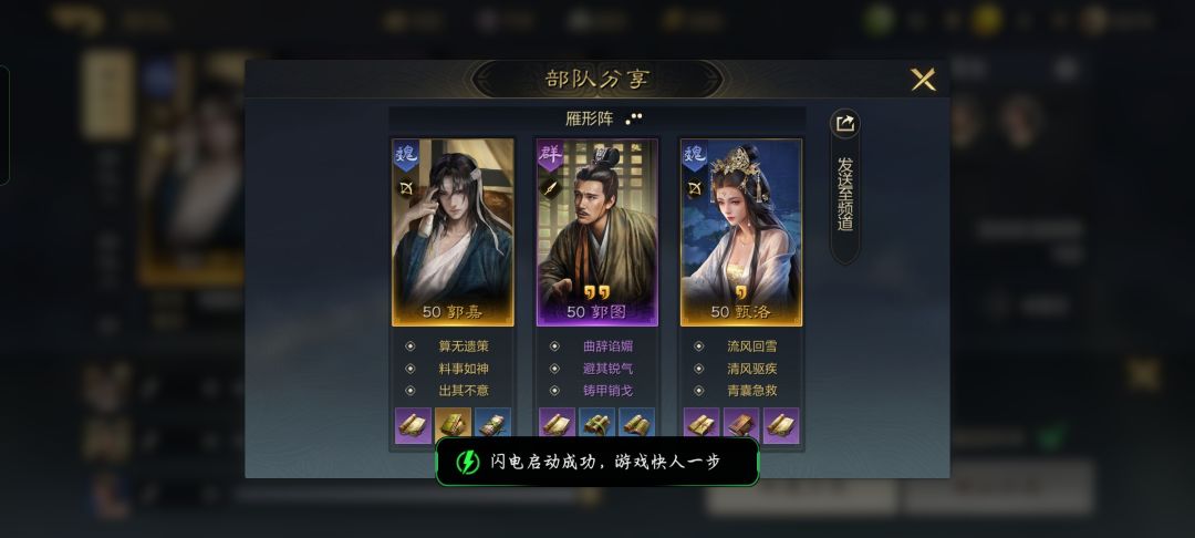 雁形阵迎战对手,曹操和甄洛被放到前排增加防御,给后排的郭嘉挡刀。战法搭配上,曹操后续学习了避其锐气和蓄势待发,韬略是孟德新书上卷打头,之后又研读了大破和气临的善本。 同样与家公曹操在前排掩护郭嘉的甄洛,其流风回雪战法只能是把洛神效果增益给唯一的后排选手郭嘉。韬略库研读了洛神赋上卷,算是把洛神的效果锁定到了全队智力最高的郭嘉身上。励军和避险的善本,则是为了让她和曹操能在前排支撑得更久。 郭嘉压轴登场