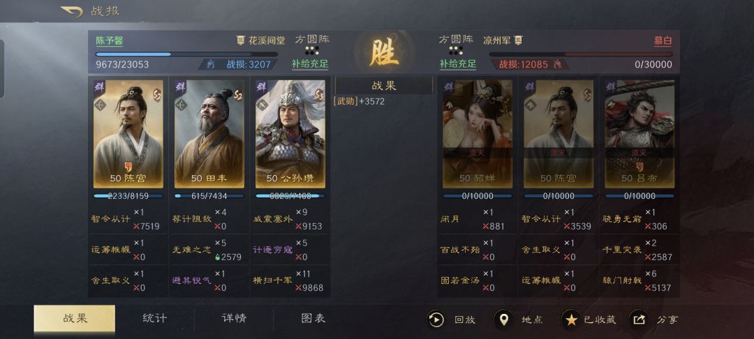 白马长史公孙瓒,在当时的游牧民族眼里,那就是人头收割机一般的存在。演义里面,这位白马将军甚至跟吕布都有过正面的交锋,尽管才打了几个回合他就败走了,可是能从吕布那里全身而退,至少也说明他还是有相当实力的。S3赛季新增的公孙瓒,在当前版本的三国谋定天下里也算得上是一号大牛! 在此特别鸣谢游戏ID名为“陈予馨”的玩家朋友,给本文提供了宝贵的创作素材。他利用麾下的陈宫、田丰和公孙瓒摆出方圆阵,才半场的时间
