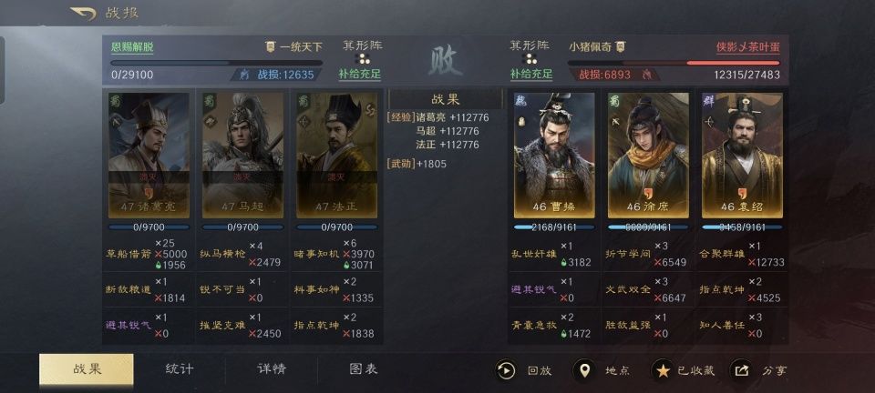 设想你的部队此时战到只剩下15000兵力,而马超那一支的士兵人数更是只有3000,碰上满编30000人的队伍还有胜算吗?本文带来的战报,可谓是倒反天罡的典范,马超就是带着他残存的3000铁骑翻盘的。 在此特别鸣谢游戏ID名为“幽客”的玩家朋友,给本文提供了宝贵的创作素材。他的乐进、大乔和马超摆出的偃月阵,竟然在战场上拥有如此韧劲,15000的残军还能啃掉30000兵力的曹魏谋臣队,实在是令人佩服。