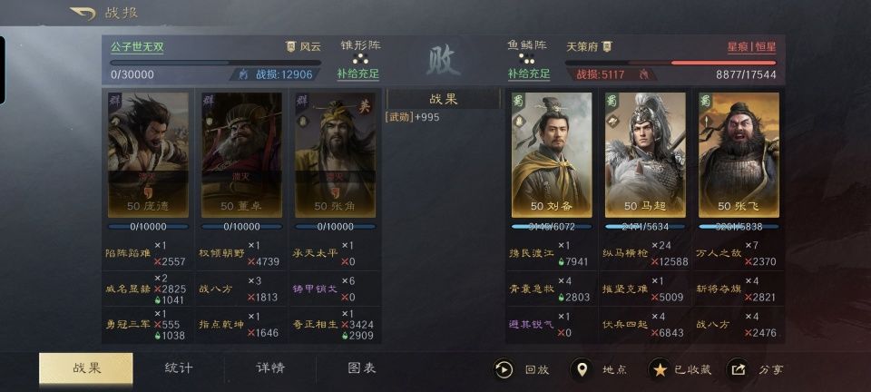 在武将的等级和红度相同的情况下,极少有玩家能够做到只用10000多的残兵还能反杀对面多达30000满额兵力的敌人吧。所以,在我看来,那些兵力悬殊条件下还能以少胜多的战例,就都有拿出来面向大家分享,并且仔细总结分析的价值。 这个游戏ID名为“星痕丨恒星”的玩家朋友,他就分享出了一份自己的忠义骑以17000兵力逆转庞德、董卓和话本张角组成30000满编黑科技战队。其思路相当精巧,让人看后不禁大赞,让我