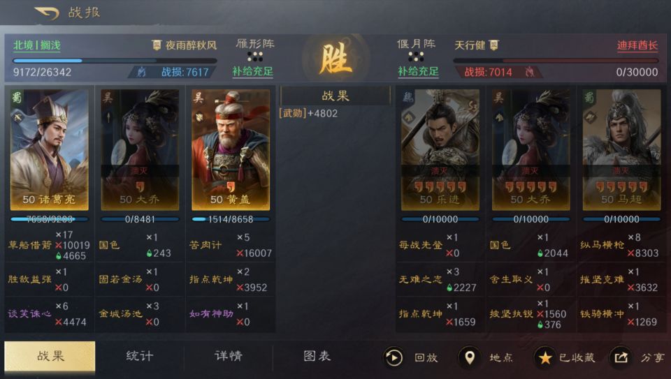 大乔、乐进和马超都是满红状态,这样的一支大乐马组合,相信在如今版本的三国谋定天下里,是没有几支队伍有底气上去叫板的了。然而本文带来的战报,却足以称得上是教科书式的倒反天罡! 在此特别鸣谢游戏ID名为“北境丨搁浅”的玩家朋友,给本文提供了宝贵的创作素材。北境丨搁浅自己都想不到,他用白板的大乔、黄盖和诸葛亮摆出雁形阵,竟然在武将红度和现役兵力都处于劣势的情况下,把对面的满红大乐马给团灭了,而且只用三个