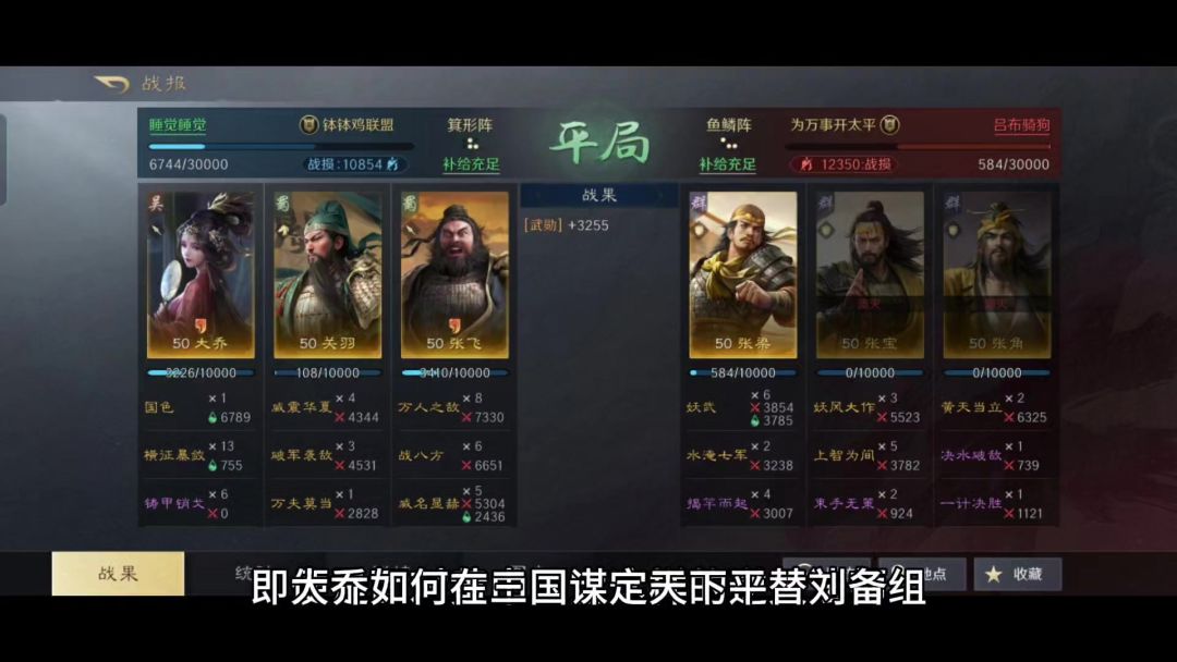 桃园结义刘关张,堪称三国这个IP里最有知名度的男团。尤其是在如今版本的三国谋定天下,桃园队在游戏里依旧是个相当拉风的配置。其中最关键的续航核心,就是身为大哥的刘备,携民渡江的治疗效果是公认的无人能及! 本文灵感的提供者,是一个游戏ID名为“睡觉睡觉”的哥们。他大概率是还没有抽到刘备,就只能用自己首充得到的大乔来尝试平替。好在他的搭配倒也算得上比较科学,令他连续打出了多次连斩,起码证明了这个变种桃园