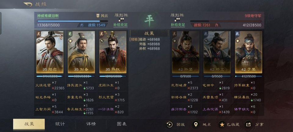 刘备和孙权,他们既因为赤壁之战成了生死相依的盟友,又因为白衣渡江而成了不共戴天的死敌。如今的诸多三国题材SLG游戏,都不乏刘备、孙权和曹操的三皇队,然而三国谋定天下里的“二帝并尊”搭配,却在不经意间捧起了S2赛季的新晋武将陆逊! 特别鸣谢游戏ID名为“神威难藏泪啊”的玩家朋友,他在世界公频分享的刘备、孙权加陆逊开9级地的战报,就赢得相当轻松。特别是对于陆逊的使用,其思路相当清晰且明智。他所摆出的雁