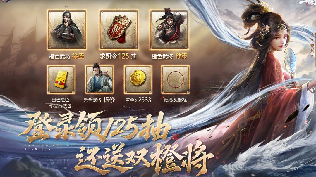#三国谋定天下创作征集令 三国SLG策略游戏一直是大多数玩家优先选择的题材之一,喜欢玩三国策略游戏,但是高额的抽卡价格和偏低的出卡率阻拦了大多数玩家的脚步,想在战场上打的刺激,但又苦于囊中羞涩而无法获得高质量游戏体验,本期推荐这款《三国:谋定天下》,绝对让你眼前一亮,体验高质量三国策略手游!新人入坑就送125抽和徐盛孙策双橙将,拥有三国游戏圈内极低的抽卡价格,抽卡5抽仅需390金、出橙率远高于其
