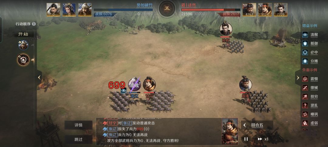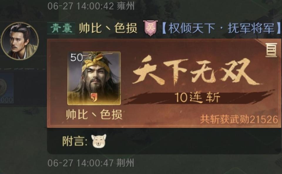 都知道鲁肃能够凭借划湘分荆,在三国谋定天下里成为一众追击型武将的克星。不过本文要给大家讲解的战报,偏偏就是用追击战法克制鲁肃!各位要是好奇,那就接着往下吃瓜吧! 特别鸣谢游戏ID名为“姜子牙”的玩家朋友,给本文提供了宝贵的创作素材。果然人如其名,排兵布阵方面是相当的奇思妙想。 利用乐进、文丑和黄月英摆出偃月阵,开战仅仅两个回合就打掉了都督队的鲁肃。周瑜和孙权失去了前排肉盾保镖,很快也就跟着崩了。靠