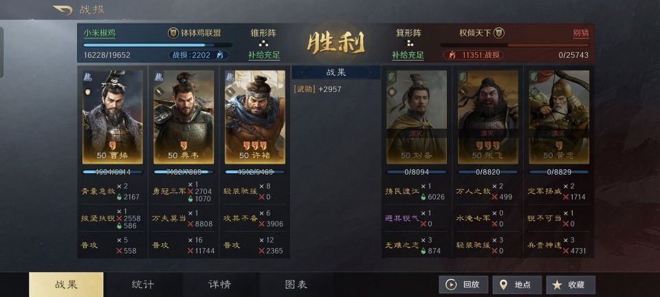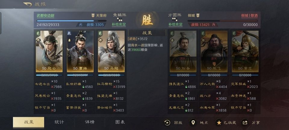 虽然常山赵子龙和西凉锦马超都是曹操非常想要收服的猛将,然而他们最后都跟随了刘备。这对于曹老板来说,确实是个巨大遗憾。好在后世的诸多三国题材SLG游戏,总是能够额外创作很多天马行空的武将搭配方案,自然也包括了让曹操、赵云和马超成团的情况。 让我们在此特别鸣谢这个游戏ID名为“武都安边尉”的玩家朋友,从他分享的战报可以看出,曹操插足在赵云和马超之间的效果也是相当不错的。面对着刘备、张飞和黄忠组成的忠义