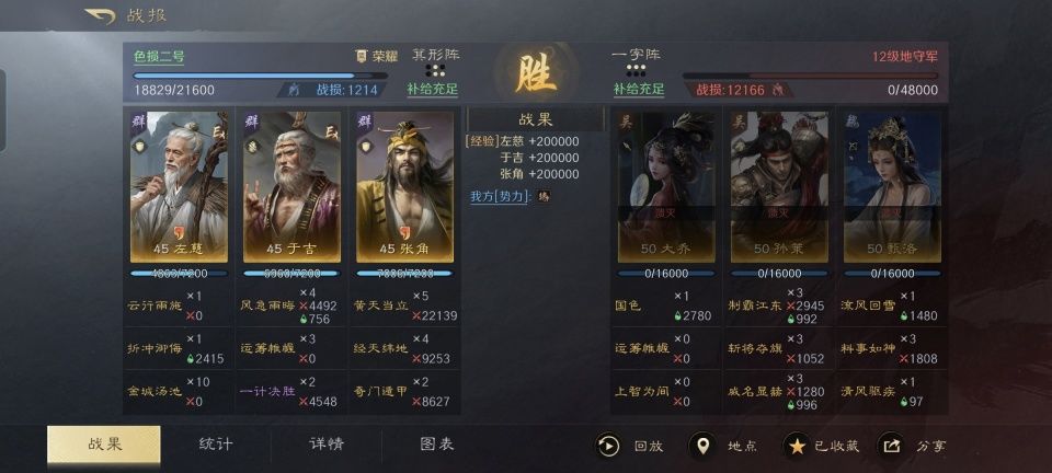 想要尽可能发挥出丹阳精兵的威力,所有出战的武将必须都得携带盾兵,很多朋友自然会马上联想到左慈、于吉和张角组成的三仙盾。早在S5赛季的时候,他们就已经用各种漂亮的战绩证明了自己的强大实力,S6组合丹阳精兵,必须是锦上添花啊! 特别鸣谢游戏ID名为“色损二号”的玩家朋友,给本文提供了宝贵的创作素材。他将麾下的左慈、于吉和张角排出箕形阵,十分轻松的拿捏了对面12级资源地块上的48000守军,当中有哪些创