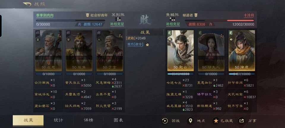 试问乐进、吕布在前排,曹纯在后排的偃月阵你慌不慌?而且他们三个还都是满红,对于大多数三国谋定天下的玩家朋友们来说,遇上这阵容怕是没什么生还几率了。不过本文要讲解的战报,堪称一次完美教科书式的倒反天罡! 特别鸣谢游戏ID名为“花丨仲谋处”的玩家朋友,给本文提供了宝贵的创作素材。他利用麾下的赵云、姜维和甘夫人摆出鱼鳞阵,故而我给起名如鱼得水枪,这个组合在半场之内就把对面的满红先登吕给逼到了绝境。白板打