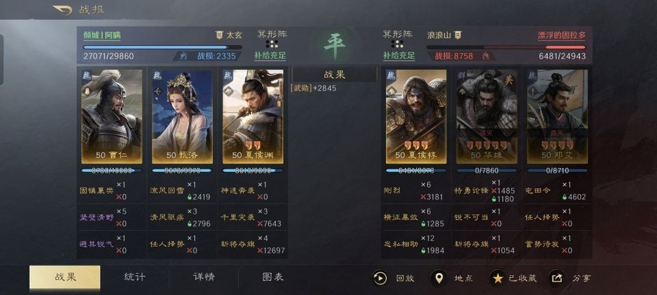 曹仁和夏侯渊尽管在历史上都为曹魏政权立下了赫赫的军功,然而三国谋定天下的游戏次元里,历经了两个赛季也并没有让他们成为热门角色。所以但凡能够看到关于他们的战报,都足以称得上是比较少见的。 在此特别鸣谢游戏ID名为“倾城丨阿瞒”的玩家朋友,利用麾下的曹仁、甄洛和夏侯渊为我们上演了一场精彩的战斗,也给本文提供了宝贵的创作素材。他们本场面对的,是由夏侯惇、邓艾和话本版华雄组成的敌阵,其中的话本版华雄,更是