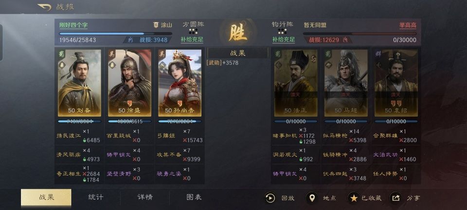 孙刘联盟为了互表诚意,索性让孙尚香跟刘备进行了联姻。年芳二八的郡主面对着一个在年龄上完全可以做自己爸爸的男人,你说爱情的成分到底有多少呢?目前版本的三国谋定天下里,这对联姻夫妻同时登场的情况并不多见,所以本文带来的战报,算得上比较猎奇的。 特别鸣谢游戏ID名为“刚好四个字”的玩家朋友,给本文提供了宝贵的创作素材。以刘备、徐盛为方圆阵的前排,孙尚香做后排的配置,竟然能够轻松拿捏对面赵云、诸葛亮和黄月