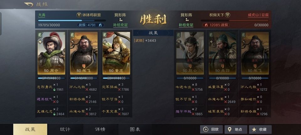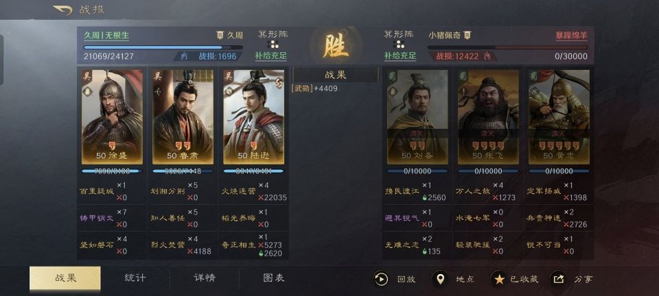 别看黄忠老将军是蜀汉五虎上将里面年纪最大的,可他在三国谋定天下的游戏次元里,却堪称输出和发挥最为强势且稳定的。要是升到满红的黄忠,其威力就更是令人谈之色变了。 然而本期要讲解的战报则颇为特别,满红的黄忠竟然全场只贡献出了4708点伤害量,这对于忠义弓来说实在是太跌份了。而造成这一切的,是徐盛、鲁肃和陆逊组成的都督缴械队,在此特别鸣谢游戏ID名为“久周丨无根生”的玩家朋友,让我们见识到了如此成功的缴