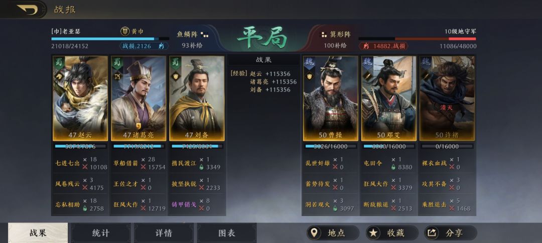 眼下,应该已经进入了开荒期的尾声。从如今的形势来看,S3赛季新增的庞统还是相当实用的,毕竟连环起来的传递伤害会让我们的攻势事半功倍。跟赵云一起打配合,也是相当节省能耗的方案。 在此特别鸣谢游戏ID名为“涂山平丘月初”的玩家朋友,给本文提供了宝贵的创作素材。他用麾下的赵云、刘备和庞统摆出鱼鳞阵,这次是子龙和凤雏的龙凤骑,打11级野地也是手到擒来。接下来,就带着各位详细复盘涂山平丘月初的搭配思路,对于