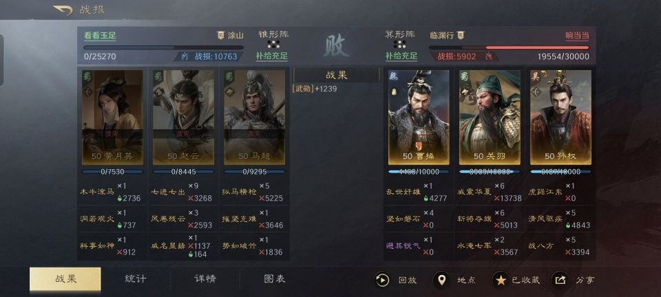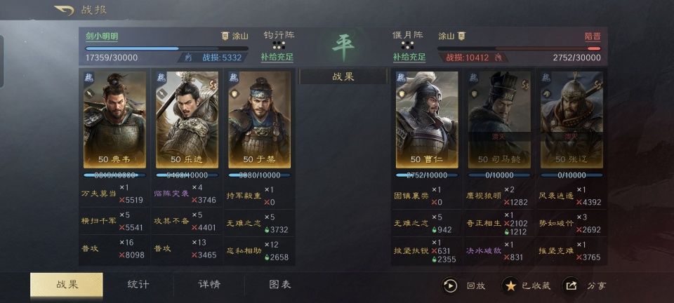 毒士贾诩和狼顾司马懿,在当前版本的三国谋定天下里,还是多少占据着一席之地的。即便面对三仙队,他们也有着可观的胜率。不过相比起来,马超、大乔和乐进的大乐马也颇具实力,本文讲解的,就是一场大乐马以20000残军逆转30000满编毒狼法师的战报。 特别鸣谢游戏ID名为“極丨小乌兹”的玩家朋友,给本文提供了宝贵的创作素材。他的大乐马组合摆出的是偃月阵,3回合之内就抢到了贾诩当一血。具体的思路如何,且看下文