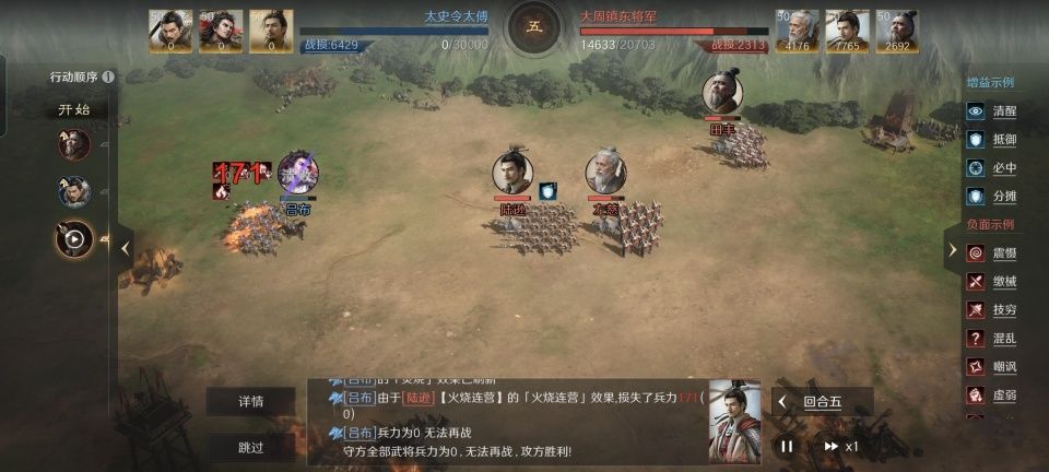无论是天下无双的吕布还是西凉骁将华雄,他们在当前版本的三国谋定天下里,都是非常注重普通攻击伤害的。因此,但凡能够缴械的武将,就成为了他们的克星。只不过令很多人意想不到的是,于禁这个软弱的投降派,竟然能在游戏里爷们一回,甚至凭一己之力把吕布和华雄都制服了。 特别鸣谢游戏ID名为“永昌虎卫军”的玩家朋友,给本文带来了宝贵的创作素材。他利用于禁、荀彧和司马懿摆出箕形阵,18000多的残军兵力依旧打趴了对
