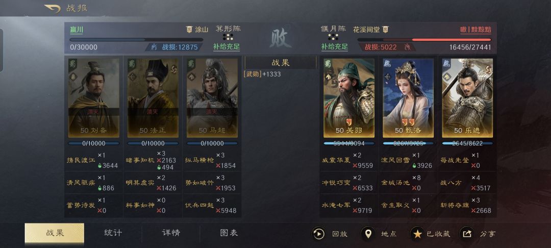 关羽一直都想跟马超掰手腕,遗憾历史没有给他那个机会。尴尬的是,三国谋定天下的游戏次元里,马超在玩家们心里的份量在总体上却比关羽重得太多了。根本原因就是马超发挥稳定, 而关羽总是特别爱演。 特别鸣谢游戏ID名为“嗷丨黩黥黯”的玩家朋友,给本文提供了宝贵的创作素材。他用关羽、乐进和甄洛摆出偃月阵,可算是请了青龙偃月刀的正主出战,仅用四个回合就把对面的刘备、法正和马超逼到了弹尽粮绝的地步。先登关羽凭什么