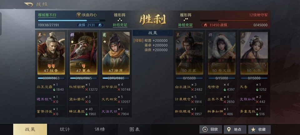 司仓这个职业, 在三国谋定天下里实在是不愁物资,这也导致了他们有着极高的试错成本,反正家里吃不完的粮,小兵这种耗材在游戏里面怎么折腾都没事儿。一旦配出了新的东西,就又是一个重大发现! 本期的主角,是一个游戏ID名为雁城雁不归的兄弟。他用47级的程普、董卓和徐庶,轻松推掉了12级地,并分享出了具体的战报。玩三谋的朋友们都知道,这三个角色的强度都不算顶级,至少目前来看不是。然而就能力构成来说,他们三人