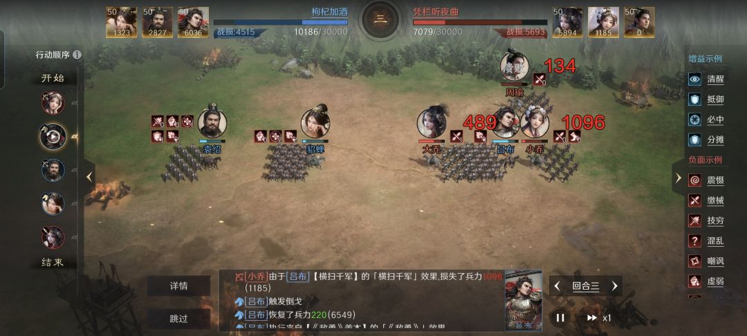 女士优先原则,还是先让处于箕形阵前排的貂蝉出来亮相。第二和第三战法,分别学习了无难之志和屈人之兵,韬略库里的金书研读了祸水,紫书则是劫智和练士的善本,吕布的连击输出将大为受益! 这一场的袁绍实在是太会玩了,合聚群雄能让全队武力值和先攻值最高的吕布频繁找对面的铜雀弓拼刺刀,第二战法指点乾坤也主要是为了让吕布多几次打人的机会。韬略库里搭配了三本紫书,依次是敌勇、合战和先勇,继续为吕布铺路。 有了袁绍的