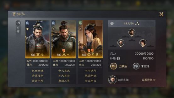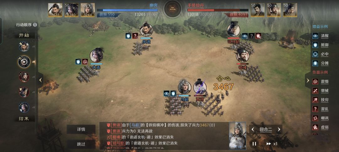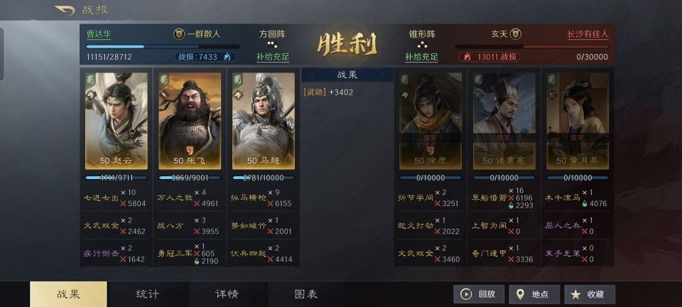 设想你的部队此时战到只剩下15000兵力,而马超那一支的士兵人数更是只有3000,碰上满编30000人的队伍还有胜算吗?本文带来的战报,可谓是倒反天罡的典范,马超就是带着他残存的3000铁骑翻盘的。 在此特别鸣谢游戏ID名为“幽客”的玩家朋友,给本文提供了宝贵的创作素材。他的乐进、大乔和马超摆出的偃月阵,竟然在战场上拥有如此韧劲,15000的残军还能啃掉30000兵力的曹魏谋臣队,实在是令人佩服。
