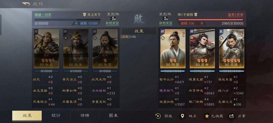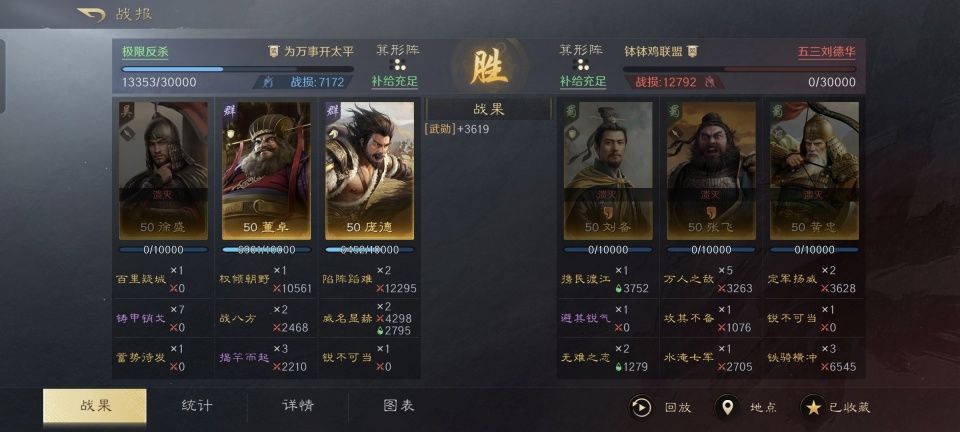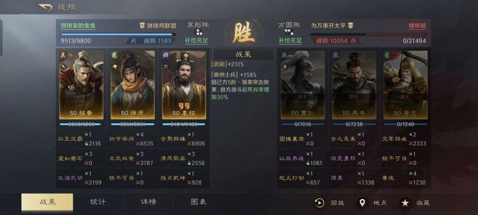 四世三公的袁绍,因为在官渡之战败给曹操,而总是被后世人低看一眼。江东老臣程普,因为被大都督周瑜抢了风头,而显得存在感偏弱。这两个本事一流的苦命人,在三国谋定天下的游戏次元里尽管也是橙将,却因为这个原因而没能得到足够的重视。 故而给本篇文章提供素材的投稿者,游戏ID名为“饼饼家的兔兔”,就非常值得隆重感谢了。因为他在世界公频里所分享的这场战斗,是自己这边的袁绍、程普和徐庶只带着9000多兵力,逆转了